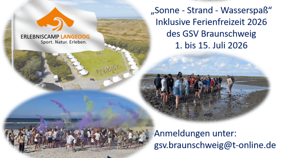 Nach einem tollen Ferienaufenthalt auf der Nordseeinsel Langeoog, steht schon der Termin für 2026. Der GSV organisiert zum 14. Mal eine 14 tägige inklusive Ferienfreizeit, vom 01.07. bis 15.07.2026 im Erlebniscamp der Sportjugend Niedersachsen auf Langeoog. 30 Betten für Kinder und Jugendliche im Alter von 9 bis 15 Jahren sind buchbar.
