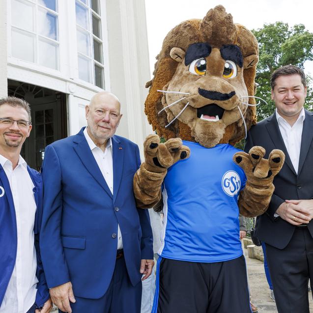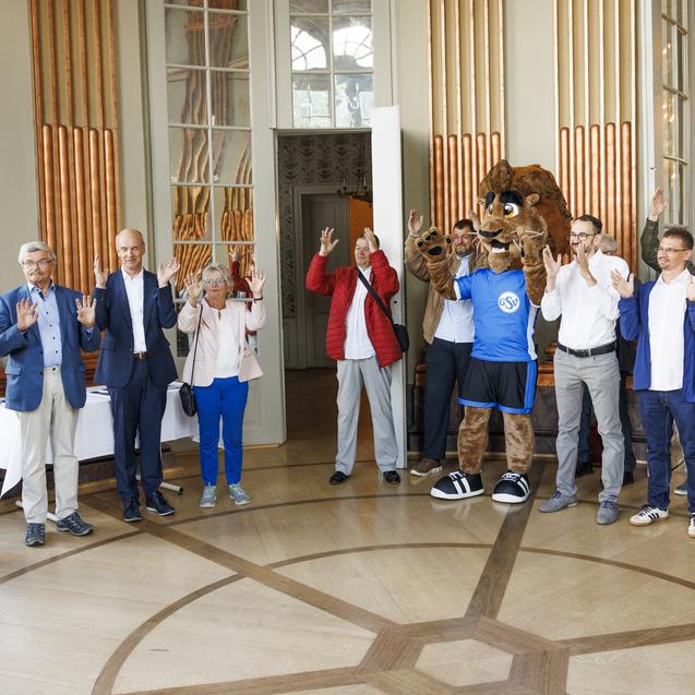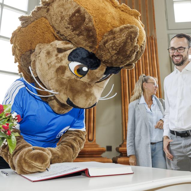 Große Aufmerksamkeit hatte auch das Maskottchen des Vereins, dass sich spontan gleich mit dem Oberbürgermeister fotografieren ließ. Anschließend folgte das Gruppenbild auf der Terrasse des Schlosses, bevor sich dann alle in das Goldene Buch der Stadt Braunschweig eintragen könnten. Der offizielle Teil war damit beendet und es gab dann ein Gläschen Sekt und Gebäck.